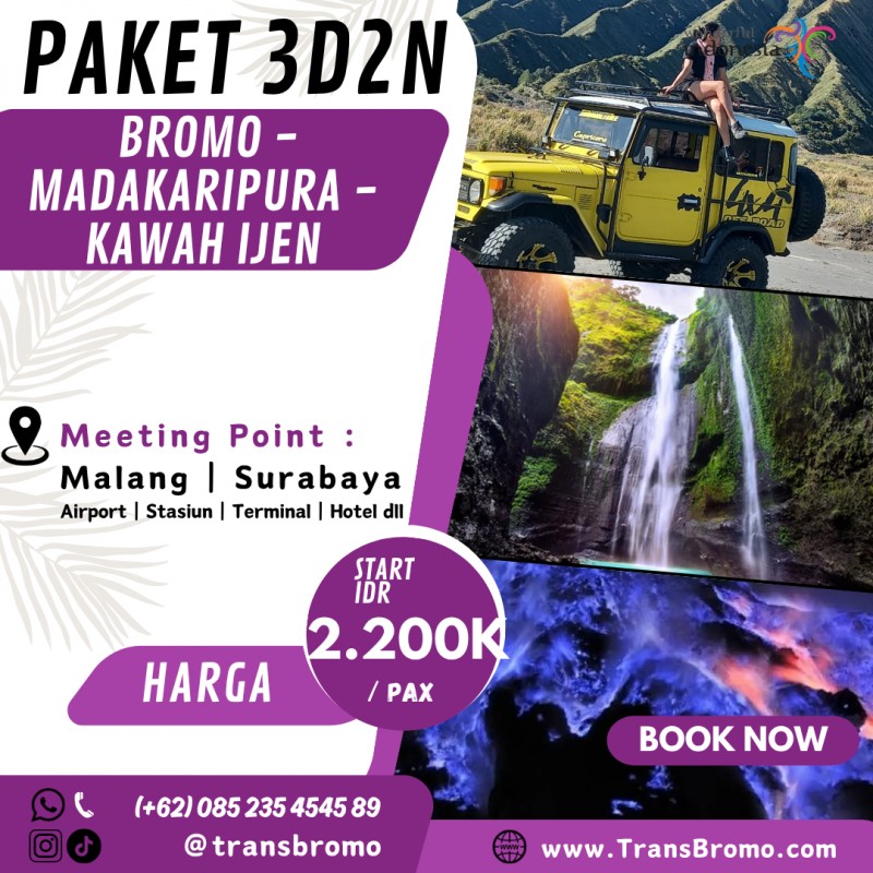 Anda ingin booking atau ingin info lebih Paket Wisata 3 Hari 2 Malam Bromo, Air Terjun Madakaripura dan Kawah Ijen?