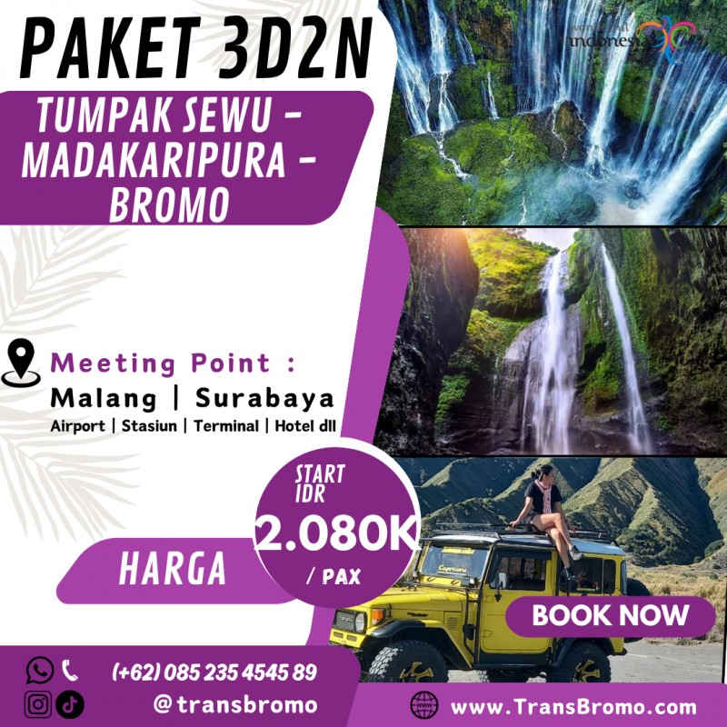 Anda ingin booking atau ingin info lebih Paket Wisata 3 Hari 2 Malam Tumpak Sewu, Air Terjun Madakaripura dan Bromo?